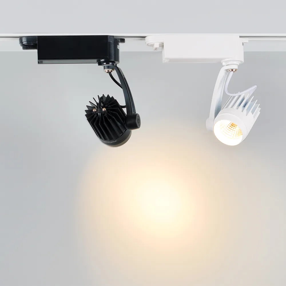 Подвесной светильник для треков/шин 2 провода. Светодиод CREE 9W, цвет ТЁПЛЫЙ 3000K, св.поток 675-765 лм, угол 24°. Корпус белый. Мощность 9Вт, питание AC180-240V. Максимальные габариты HxLxW: 160х80х150 мм