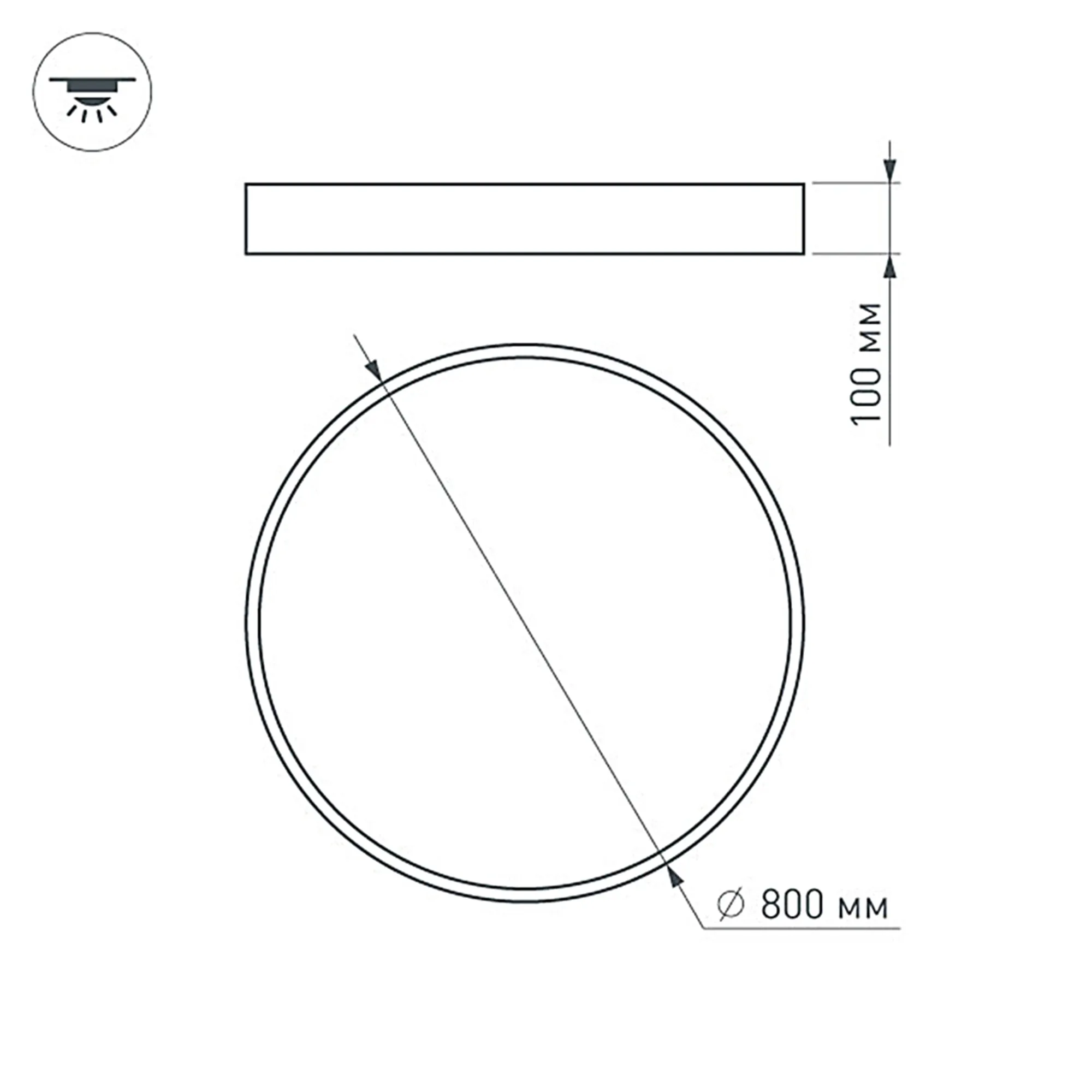 Накладной интерьерный светильник. Мощность 94 Вт, св. поток 8460 лм, 90 лм/Вт, дневной 4000 K, CRI>80, угол 120°, напряжение питания 230 В. Черный круглый корпус из алюминия, степень защиты IP20. Размер: диаметр 800 мм, высота 100 мм. Монтаж накладной. Драйвер 28-42 В, 1200 мА (2 шт.), пульсация <5%.