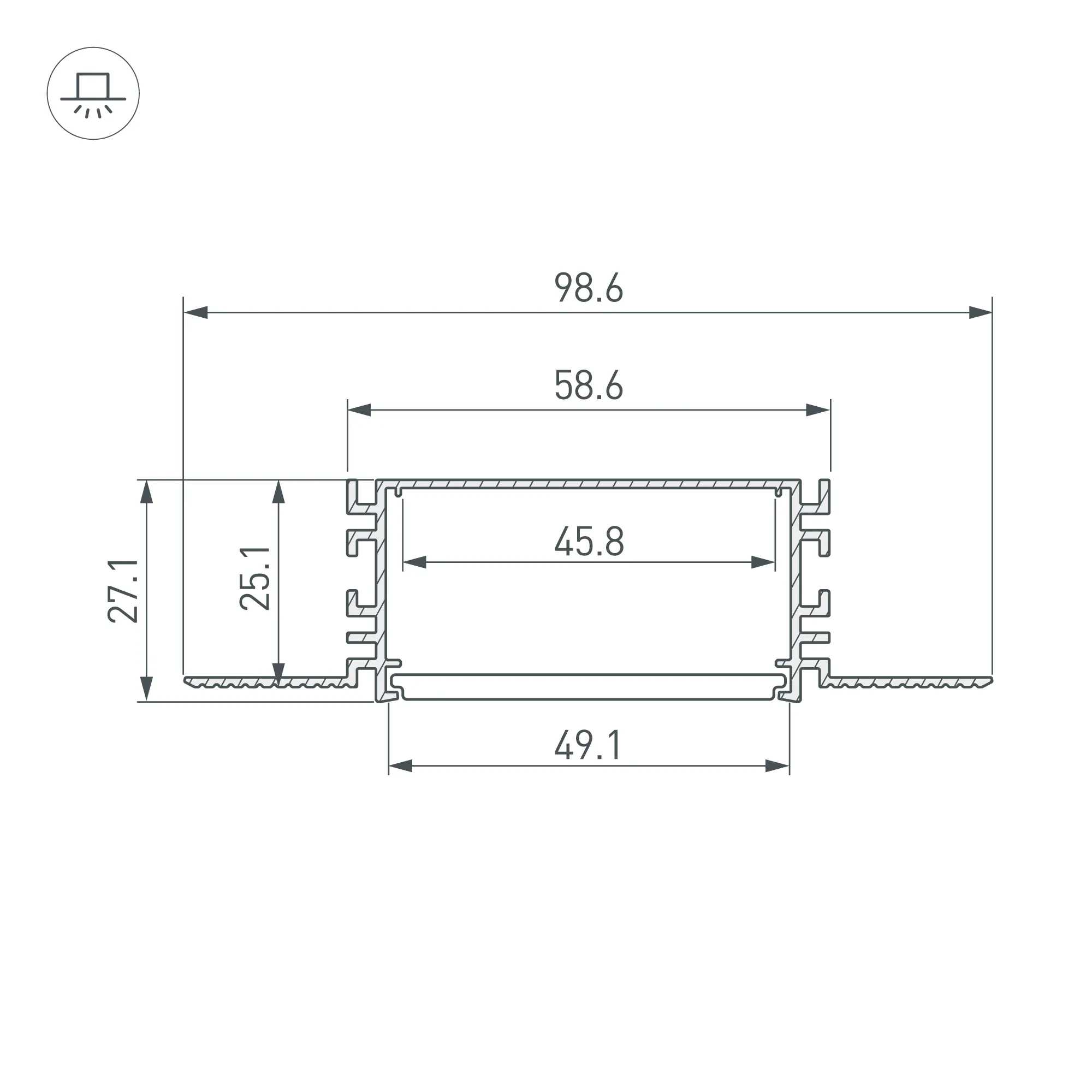 Алюминиевый встраиваемый профиль для светодиодных лент и линеек. Габаритные размеры (L×W×H): 2000х98,6х27.1 мм. Ширина площадки для ленты 45,8 мм. Экраны, заглушки и другие аксессуары приобретаются отдельно. Цена за 1 метр.