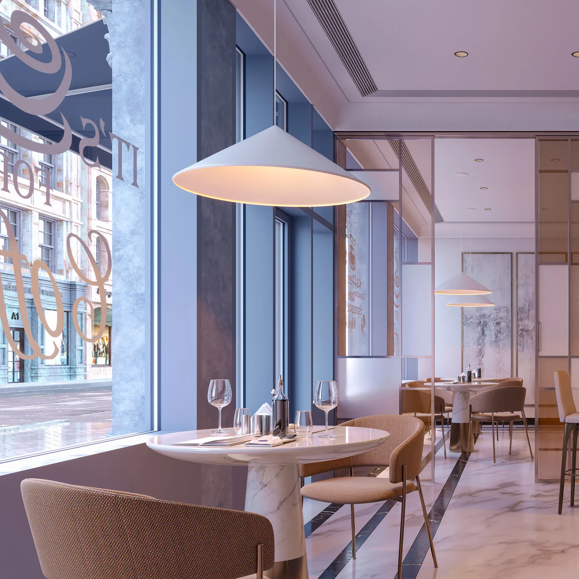 Подвесной светильник. Мощность 14 Вт, св. поток 1200 лм, 87 лм/Вт, теплый 2700 K, CRI>97, угол 36°, напряжение питания 230 В. Белый корпус из алюминия в форме конуса с белой внутренней поверхностью, линза-рассеиватель из PMMA, степень защиты IP20. Размер: диаметр 350 мм, высота 420 мм. Монтаж подвесной, длина подвеса 2000 мм, регулируемая. В комплекте 2 вида чаш. Габариты встраиваемой чаши: Ø 80x23 мм. Габариты накладной чаши Ø140x55 мм. Драйвер 27-42 В, 350 мА, пульсация <1%. Управление по TRIAC.