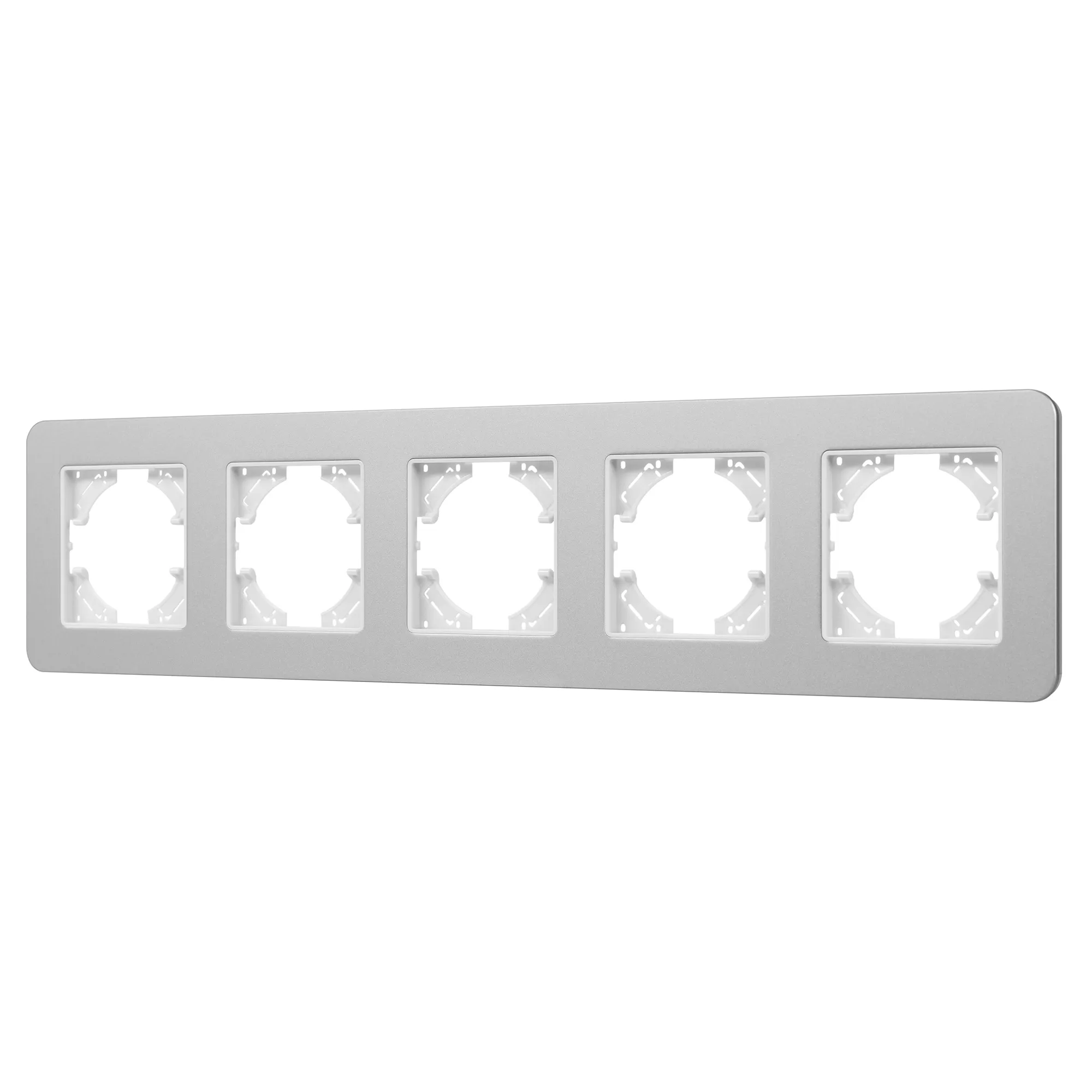 Рамка алюминиевая на 5 постов, под встраиваемый механизм. Цвет - серебристый с Soft-Touch покрытием. Уровень герметичности IP20. Ориентация монтажа - горизонтальная (основным ориентиром служат посадочные выступы для накладки механизма).