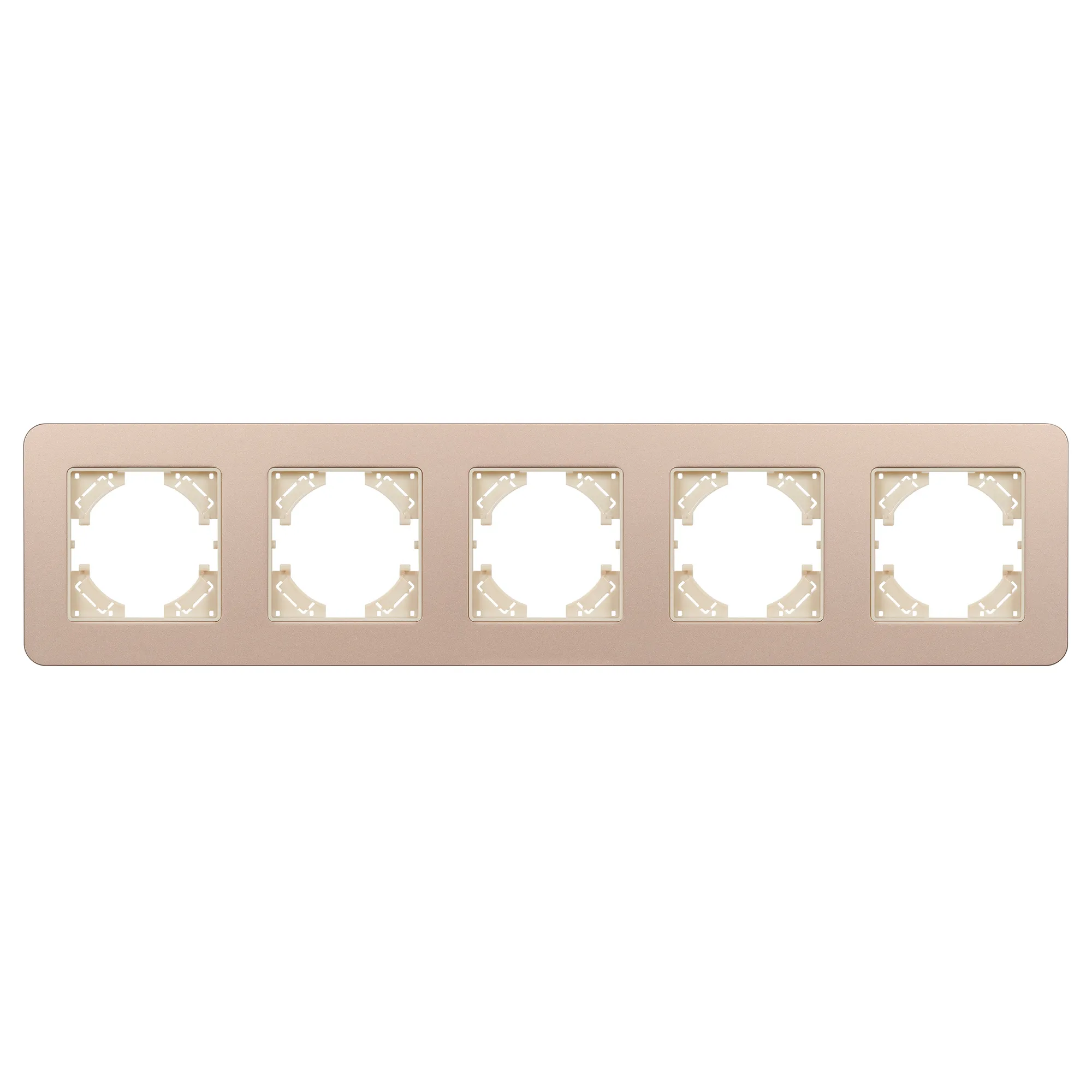 Рамка алюминиевая на 5 постов, под встраиваемый механизм. Цвет - золотой с Soft-Touch покрытием. Уровень герметичности IP20. Ориентация монтажа - горизонтальная (основным ориентиром служат посадочные выступы для накладки механизма).
