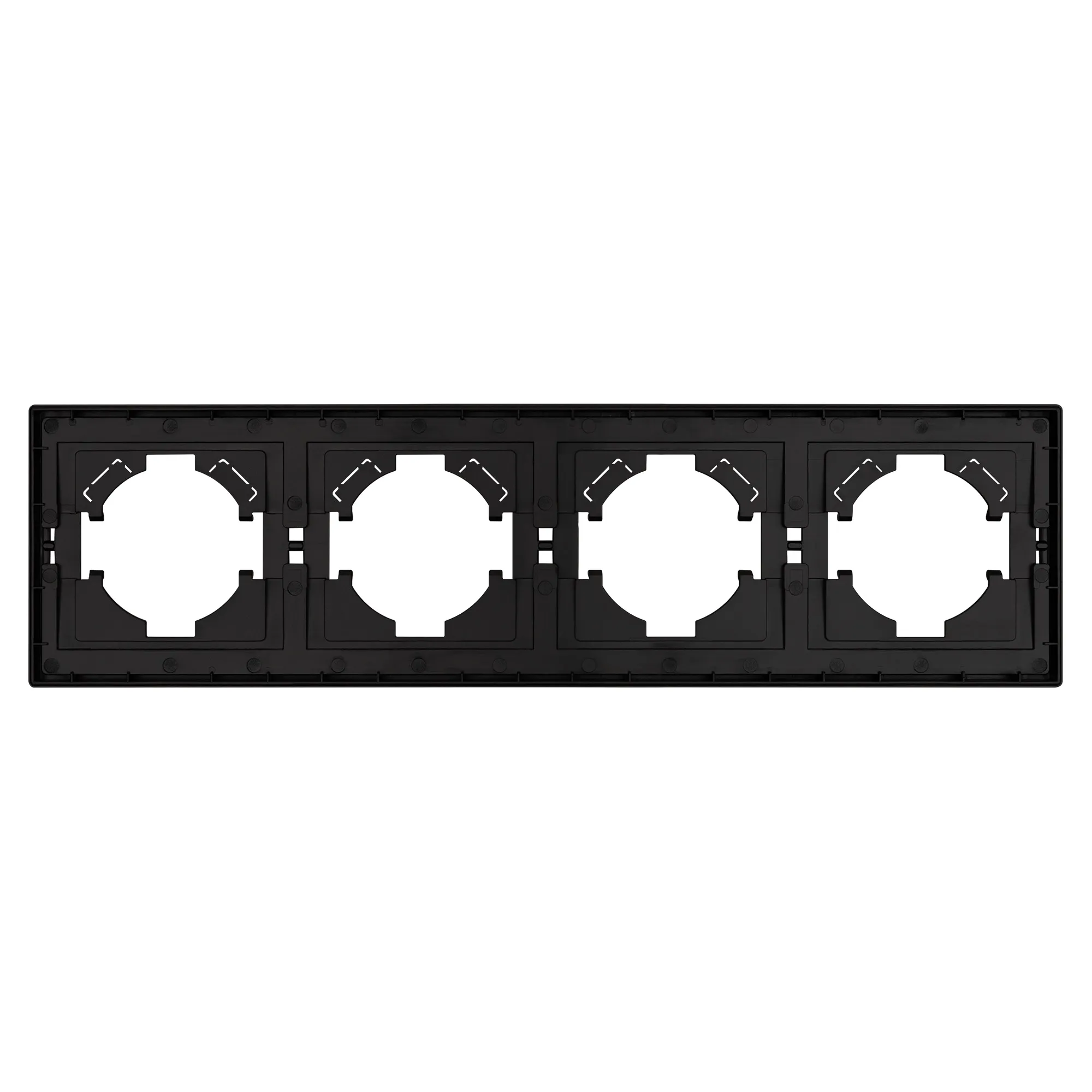 Рамка пластиковая на 4 поста, под встраиваемый механизм. Цвет - матовый черный, с Soft-Touch покрытием. Уровень герметичности IP20. Ориентация монтажа горизонтальная.